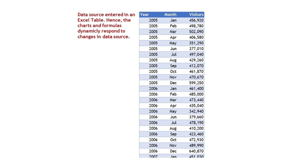 - Data entered into Excel Table—hence the chart and formulas update automatically when the datasource expands or shrinks.
