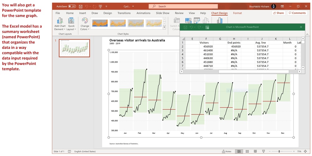 So here I'm offering you an Excel template that takes a dataset as an input and creates a Cycle Plot. You will also get a PowerPoint template for the same graph. The Excel model has a summary worksheet (named PowerPoint) that organizes the data in a way compatible with the data input required by the PowerPoint template.