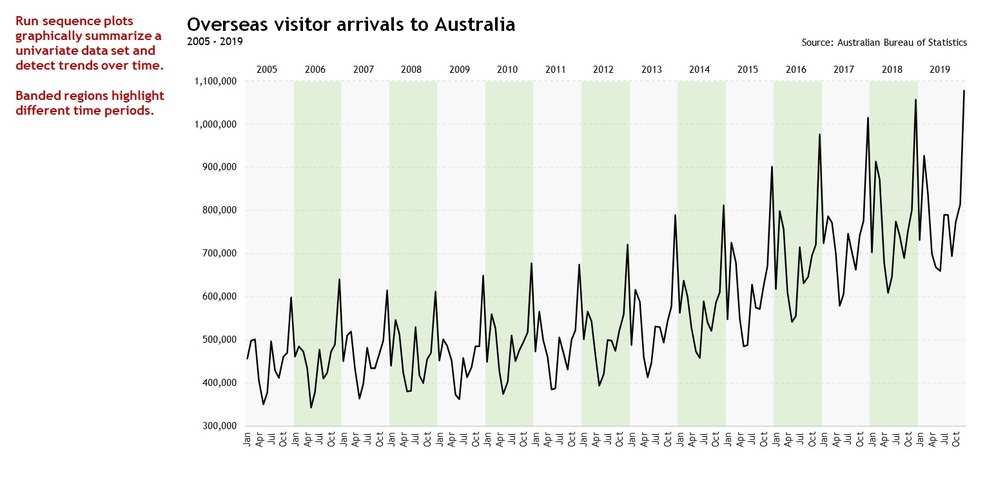 - Run Sequence Plot with banded regions highlighting different time periods—useful for detecting trends over time.