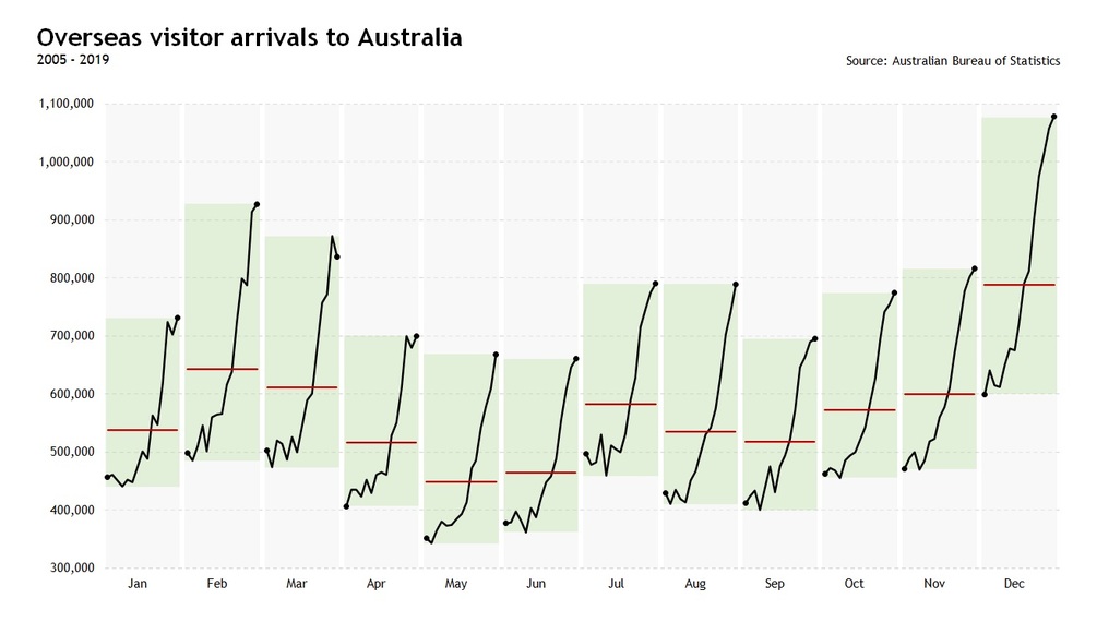 - Cycle plot with banded regions defining highs and lows by time period.
