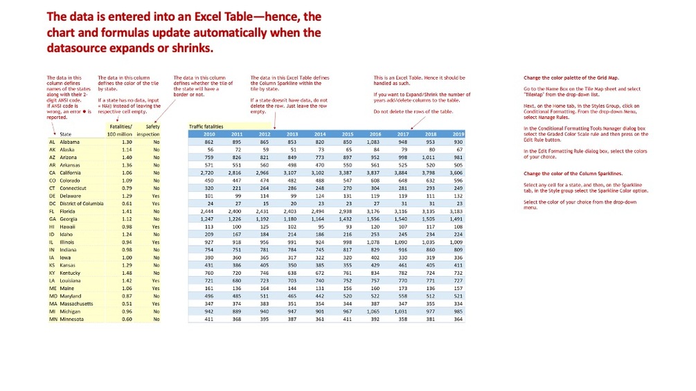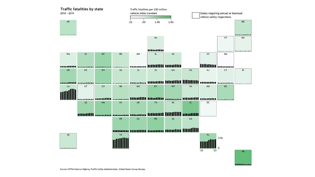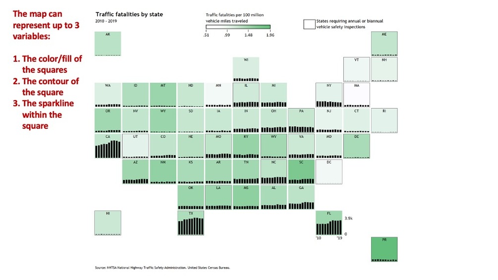 - Handles up to 3 variables, that is, variable 1 that defines the color of the square (i.e. Fatalities/100 million), variable 2 that defines the Sparkline within each square (i.e. traffic fatalities from 2010 to 2019), and variable 3 that defines the border of the square (i.e. Safety inspection).