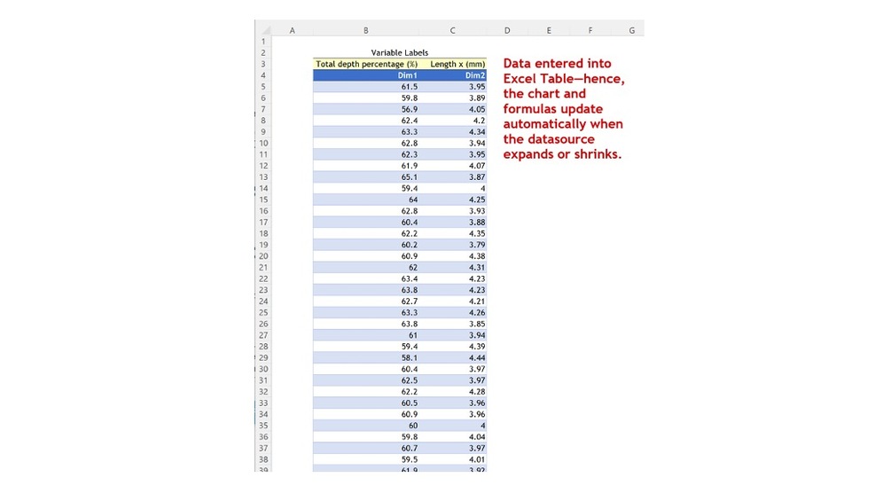- Enter the data into an Excel Table—hence the chart and formulas update automatically when the datasource expands or shrinks.
